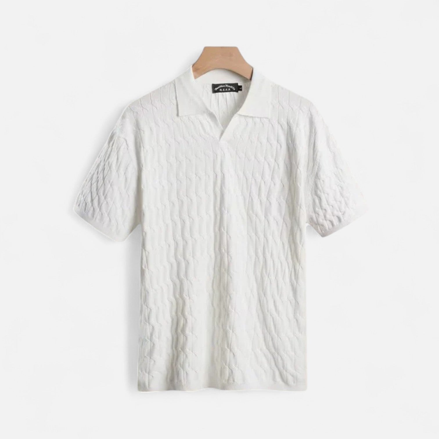 The Cuban-collar polo embodies laid-back elegance with a retro edge.