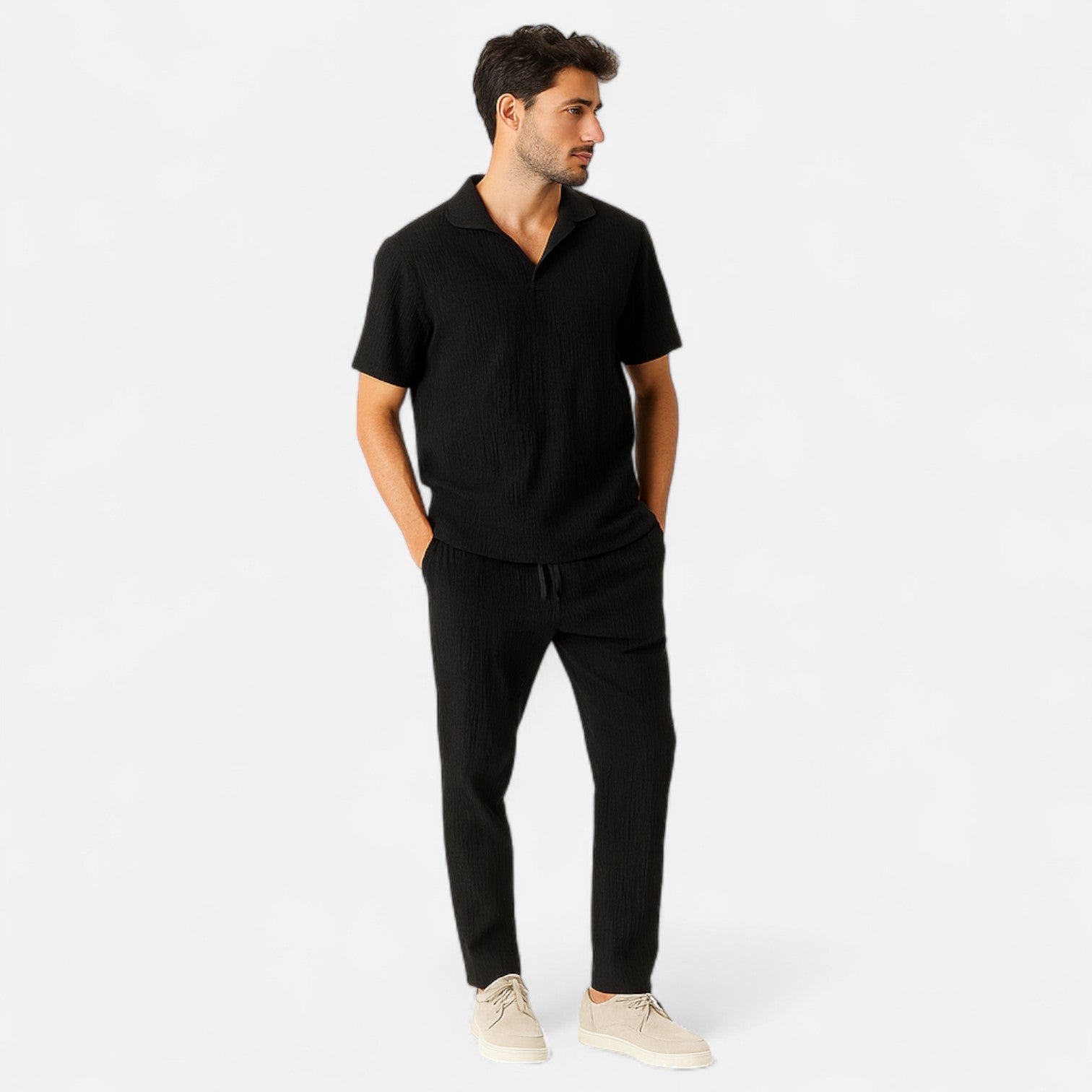 The polo set embodies controlled elegance in a practical, cohesive format.