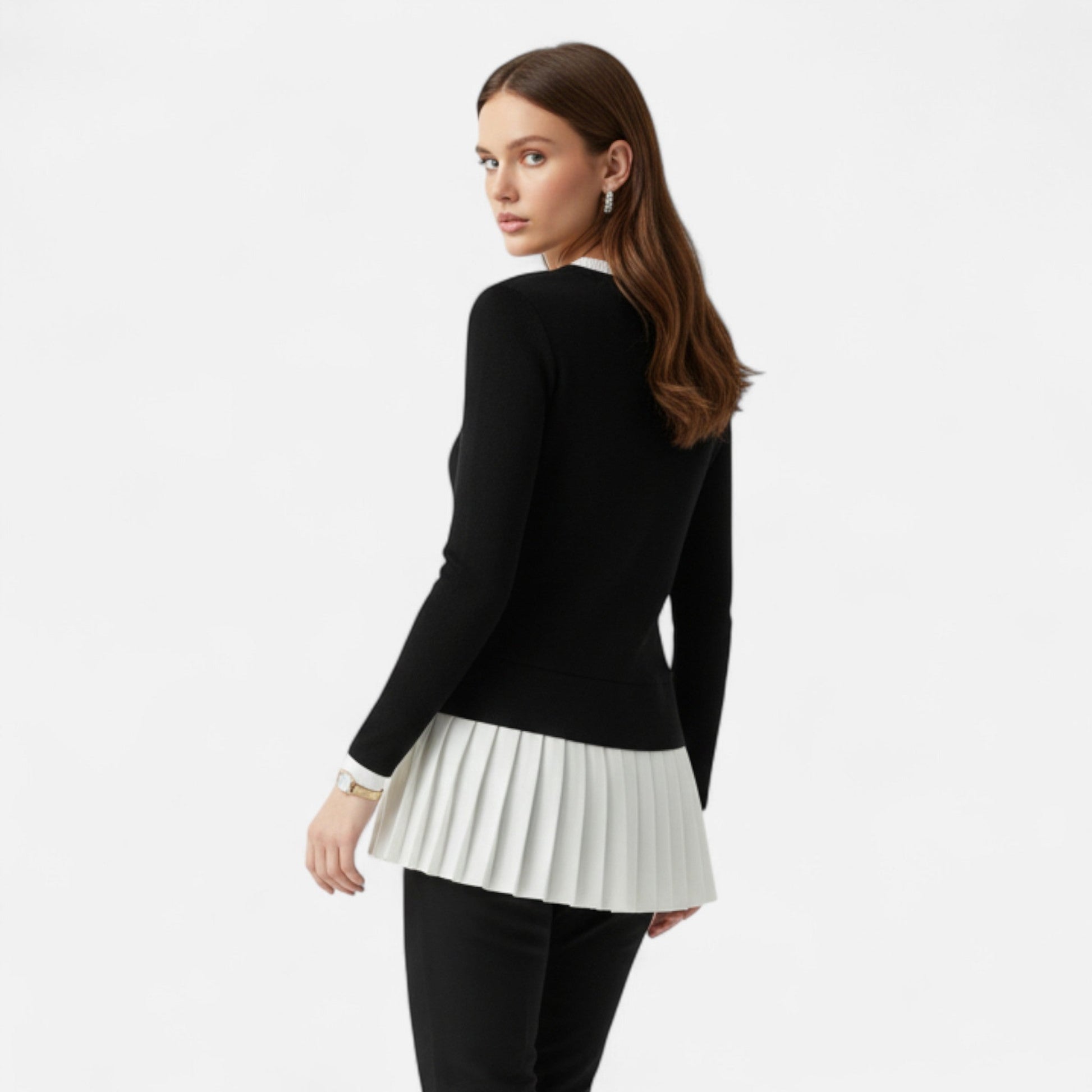 Designed for effortless all-season wear, this sweater is crafted to deliver both comfort and poise. The golden accents provide a discreet touch of luxury, while the smooth knit ensures a flattering drape and lasting ease. Whether paired with tailored trousers, skirts, or layered beneath a blazer, it is a piece that carries an air of quiet elegance in every setting.