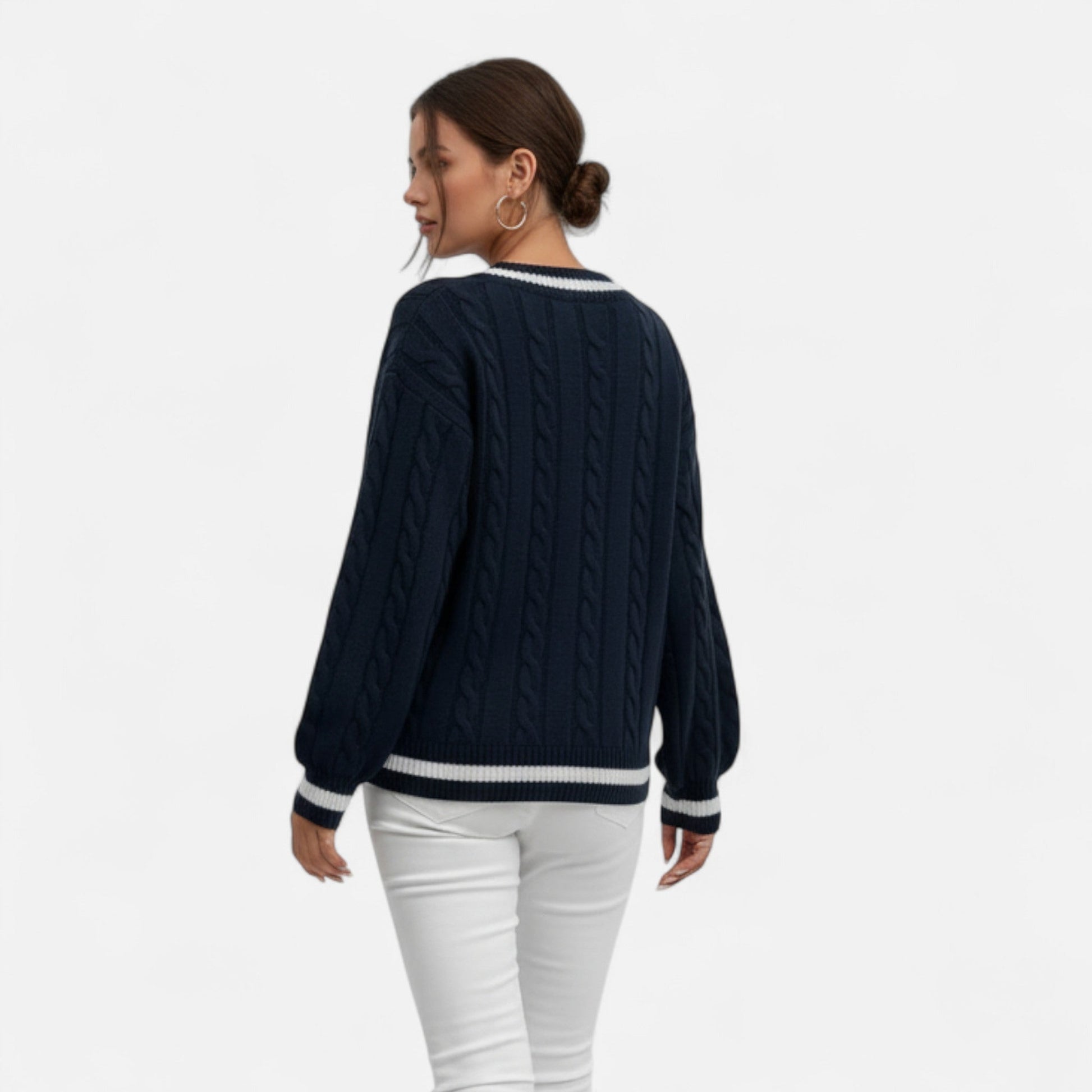 Crafted from a soft, textured knit, this sweater offers lasting comfort without compromising on poise. The twist detail adds character to a minimalist design, while the colour-block palette lends an air of effortless luxury. Ideal for autumn and winter, it pairs seamlessly with tailored trousers, skirts, or layered outerwear for a complete heritage-inspired look.